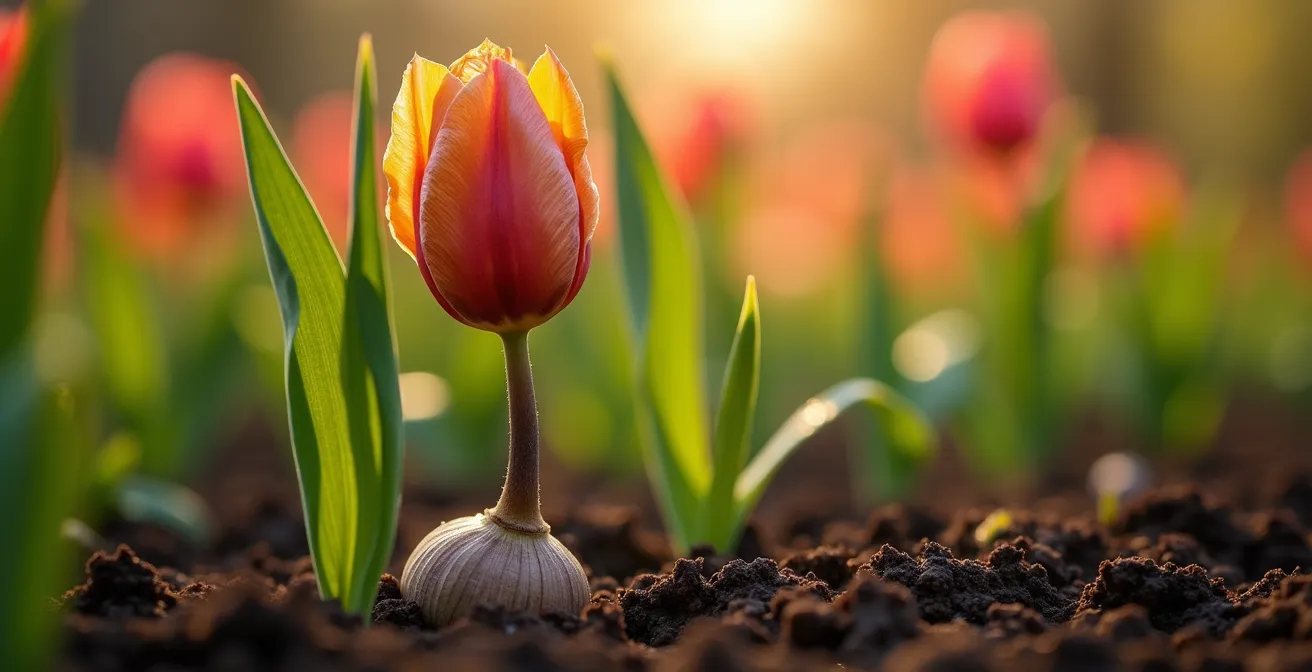 Chaque bulbe est une sorte de batterie biologique. Il contient une réserve de glucides (hydrates de carbone) qui lui permet de démarrer au printemps suivant, quelles que soient les conditions. Comme le confirment les spécialistes, la nature a déjà équipé les bulbes de tout ce dont ils ont besoin pour leur développement. Laisser la plante former des graines vide cette batterie. En coupant la hampe florale fanée, vous interrompez ce signal hormonal et forcez la plante à changer de stratégie : au lieu de se reproduire, elle va se concentrer sur le stockage d’énergie pour l’année suivante. Elle recharge son bulbe, le rendant plus gros, plus résistant et plus apte à produire une floraison spectaculaire.